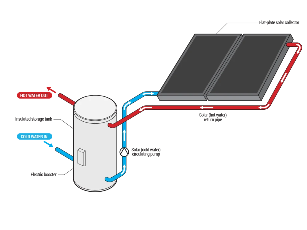 Only the solar collectors are installed on the roof, harnessing energy from the sun and transferring it to a ground-mounted storage tank. The tank can be installed indoors or outdoors in convenient or secluded locations. The working principle is simple. When the solar panels are able to add heat to the storage tanks, a small pump activates to circulate the hot water from the panels and replace the cold water from the tanks. Once the tank is filled with hot water, the pump will stop but be ready for the next cycle.